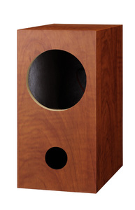 P1000Kなどのフルレンジスピーカーと組合せて使えるバスレフ型スピーカーボックス。t9パーティクルボードを使用し、仕上げはレッドチェリー。バッフル穴寸法はφ94mmで、外形寸法は121W×243H×179Dmm、内容積3.6リットル。ターミナル、内部配線コード、吸音材などもセットになっている。