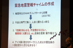 「緊急地震速報のチャイム音が完成したあとは普通に研究生活を送っていたのだが、2011年の東日本大震災で一気に注目を浴びてしまった。真似をするオウムや、チャイムを管弦楽曲に編曲する人なども現れた」と語る伊福部氏。「緊急地震速報のチャイムには、人の心や体を探求してきた福祉工学の知恵が詰まっている」と締めくくった。