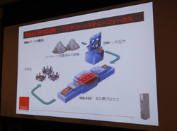 砂鉄を使ってマグネットシステムを成形する手法は通常のアプローチと大きく変わらないが、DALIでは0.1mmほどの砂鉄の粒に、さらに絶縁処理を施したSMCを使っていることが大きな違い。あらかじめコーティング処理をした鉄粉に約200トンの圧力をかけた後、500〜550度の高熱プロセスを施して完成品のパーツを成形する。こうして完成したSMC素材のパーツを、EPICONシリーズのマグネットシステムではボイスコイルの内周部とポールピースの2カ所に用いている。