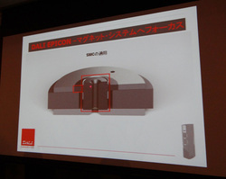 通常の砂鉄を硬化したマグネットシステムの場合はボイスコイルの上下運動で電流が流れると、不定期な「渦電流」が発生し、ボイスコイルのリニアリティを阻害し、歪みを生んでしまうことがある。一粒ずつに絶縁処理を施したSMCのメリットは、この渦電流による悪影響を効果的に回避でき、ユニットそのものの歪みを大幅に回避できる点にあるという。しかも磁気素材が持つ特性そのものは、通常のマグネットシステムと変わらないという特長も兼備する。