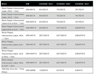 なお、エミライが既に取り扱っている「Black Pepper Interconnect Cable」などのG Ride Audio社製品について、価格改定を行うこともアナウンスされた。詳細は下図のとおり。
