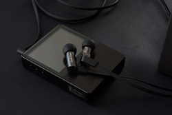 final audio design「heaven IV」特別コラボ仕様イヤホンは、ブラックメタリックの限定カラーを採用。final audio designのロゴにくわえ、Astell&Kernのロゴも筐体に記されている。「AK100 の魅力を最大限に引き出す為に特別チューニングを施した」という。