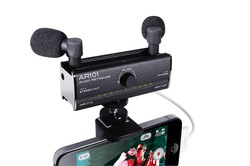本機はステレオ対応のマイク入力を搭載し、プラグインパワー型の単一指向性コンデンサーマイク2個を同梱。iPhone等のiOS機器と本機を付属の専用mini USB-30ピンDockケーブルで接続すれば、本機をオーディオインターフェースに用いたマイク録音が可能となる。
