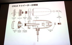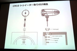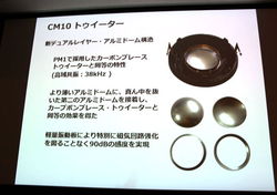 トゥイータードームも新設計。PM1で採用された「カーボンブレース・トゥイーター」で行った研究に基づき、メインのアルミニウムドームの周囲を、ドームの輪郭に沿って中心部に穴がある第二のアルミ層で補強する「新デュアルレイヤーアルミドーム構造」を採用した。澤田氏は「CM10のアルミドームは薄さが35ミクロンで、通常の50ミクロン程度のものに比べてとても薄い」と紹介。振動板を軽量にすることで特性が良くなり、高域共振周波数がB&Wの標準的なドームの30kHzに比べ、38kHzに高まったほか、磁気回路を強化せずに90dBという高感度を実現することも可能になったという。