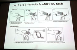 トゥイーターの保護についても、新たな試みが行われた。CM9など既存モデルは、バッフル面より前にトゥイーターが出ているため、店舗などで損傷する場合あった。これを回避するため、強固なメタルメッシュグリルが今回採用された。グリルの取り外しには専用ツールが必要で、ツールは製品に同梱される。専用ツールをトゥイーターの下に差し込み、取り外し用のボタンを押すことで、グリルを取り外せるようになる仕組みだ。