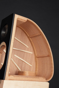 さらに、力木の配置や形状のほか、台座部の形状、底板の素材、配線材など細部に至るまでキャビネットの設計・素材を見直すことで、分解能の改善と大幅なノイズフロアの低下を実現したという。なお、キャビネット内はアコースティック楽器と同じ構造とし、吸音材を一切使用しない構成としている。
