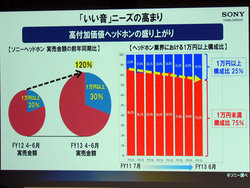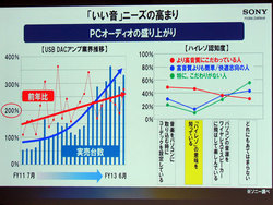 ソニーマーケティング執行役員の粂川滋氏は、ソニーだけでなく業界全体で1万円以上の高付加価値ヘッドホンの構成比が増えていること、USB-DACアンプ業界も前年比200%を超える勢いで伸びていること、「ハイレゾ」という言葉の意味を知っている人が増えていることなどを紹介しながら『「いい音」ニーズ』が高まっているとコメント。