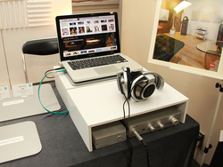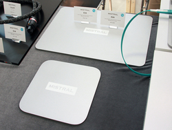 エスカートは、MISTRALブランドの新製品となるPC用オーディオボード「EVA」を出展している。PCから発生する電気ノイズを、磁気損失により熱エネルギー変換して吸収するというボードで、15インチPC用の「EVA-U15」、13インチPC用の「EVA-U13」、Mac miniサイズの「EVA-Umini」の3種類をラインナップする。