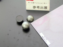 従来、アクリル樹脂をベースにしていたところをゴムに変更することで、制振性能を高めたことがポイント。開発中のインシュレーターはボール型形状で、表面を偏光メタリック仕様としている。