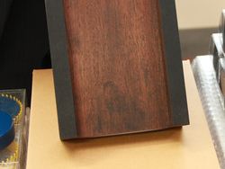 木曽工業は、電源BOX用オーディオボード「IP-22」や開発中であるインシュレーターなど、ゴム素材がベースの制振材「有機高分子ハイブリッドシート」を使用したアクセサリー製品を展示している。