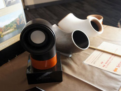 同製品は木材を重ねあわせたものを削り出し、およびくり抜いて制作。独特な形状でニアフィールドリスニングを意識していた「R-1」よりも大型で、広い部屋などでも使えるようにした。価格は「ペアで30万円から35万円の間くらいになりそう」とのことだった。