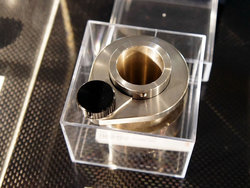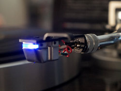 今回のイベントには、アナログプレーヤー用の光電式カートリッジ「DS001」を出展。針先の動きを光量の変化で捉えて出力するというもので、磁気から解放されることによる情報の高鮮度化を図れる点が特徴。電磁誘導の原理を応用するMM型、MC型カートリッジのデメリットである「動いた方向と逆の方向に力が発生する」という問題をクリアにできる。