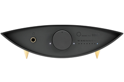 曲線を描いたボディが特徴的なDSD対応USB-DAC。底部には金属製スパイクを備え、振動の影響を抑えている。外形寸法は206.5W×60H×159.5Dmm(突起部含む)、質量862g。フロントにはボリュームつまみや、電源やサンプリング周波数インジケーター8つを備える。