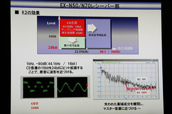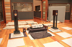 次いで、スタジオ内部に移動し、開発担当の今村智氏によるスピーカーの技術説明や、CD音源にK2テクノロジーをON/OFFした状態の比較試聴も行われた。