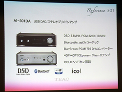 AI-301DAは、5.6MHz DSDおよび192kHz/24bitのPCM音源に対応するUSB-DAC機能を搭載したプリメインアンプ(関連ニュース)。Bluetooth機能にも対応しており、Bluetooth対応デバイス内の音源をワイヤレスで本機に伝送することもできる。さらにCCLC採用のヘッドホンアンプ回路も搭載するという“全部入り”のスペックが特徴だ。角田氏は「ハイレゾ対応はしっかり押さえながらも、スマートフォン内の音源を手軽に聴きたいというライトなシーンにも対応している。様々なニーズに応えられる製品としてアピールしたい」と語った。