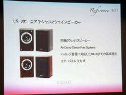 LS-301は、AI-301DAにマッチするように開発された同軸2ウェイスピーカー(関連ニュース)。従来モデル「S-300NEO」で培ったノウハウを活かして開発しており、「Air Dump Center Pole System」を採用。角田氏によれば「301シリーズのハイレゾ環境をより良く再生するため、周波数特性を40kHzまでの高域に対応させた」という。デザイン面でも、金属製のスピーカーリングを配置することで301シリーズ全体の統一性を持たせている。