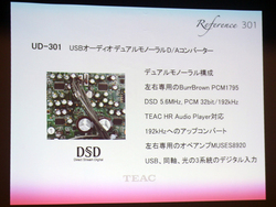 UD-301は、DSD 5.6MHz やPCM 192kHz/32bitのUSB入力に対応したデュアルモノラル構成のD/Aコンバーター(関連ニュース)。USB入力経由でDSD 5.6MHzやPCM 192kHz/32bitに対応しており、PC用の再生ソフト「TEAC HR Audio Player」を使うことでハイレゾオーディオ再生が行える。