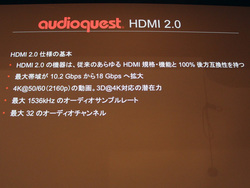 Schuetz氏はさらに、同社HDMIケーブルのHDMI2.0対応についても言及。AudioQuestがこれまで発売した10m以下のケーブルは、全てHDMI2.0の伝送に準拠しているとのこと。HDMI2.0の要件の一覧を示しながら、同社のHDMIケーブルがこれら全てを満たしているので、最新のホームシアターでも安心して使い続けてほしいと説明していた。