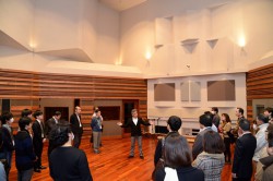 当日の参加者は約30名。簡単な説明を行われた後、ビクタースタジオのスタジオ長、秋元秀之氏が自ら先導して、通常一般の方は入ることのできないレコーディングスタジオを案内し、スタジオ内の響きの大切さに加え、マイクの違いなども解説。