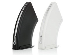 扇型の筐体は縦置き、横置きの両方が可能。筐体はアルミダイキャストとプラスチックで構成されており、両端には強化ガラスが用いられている。カラーはブラックとホワイトを用意する。