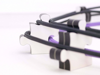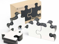 ケーブルインシュレーター「Puzz Block」は16,000円(4個1組/税別)。ジグソーパズルのピースのような形で、複数個をつなぎ合わせて使うことができる。カラーはブラウンとホワイトの2色。