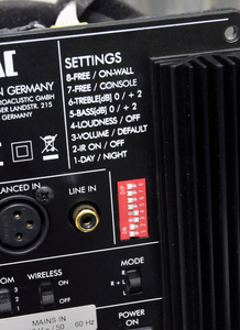 また、AIR-Xで大きな特徴となっているのが、背面に設けられた8つのディップスイッチ。壁に近づけて使用する「ON-WALL」や、広いスペースで使用する際に設定する「CONSOLE」、TREBLE、BASSをそれぞれ+2dBするモードやリモコンのON/OFF、LEDの明るさを調整する「DAY」「NIGHT」というユニークなスイッチも用意している。