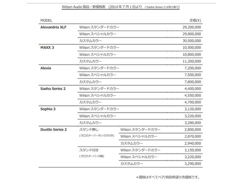 アクシス(株)は、Wilson Audio製品について、最新モデル「Sasha Series 2」を除く全製品の価格改定を7月1日より実施する。