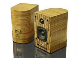 箱根小田原寄木細工の無垢材を全面バッフル板に使用したモデル。背面は曲面形状に仕上げている。 曲面を含む側面はシナ共芯合板。内部までシナ材を使用した特殊な合板の片側7箇所に切り込みを入れ、背面が丸くなる様に曲げて生成している。