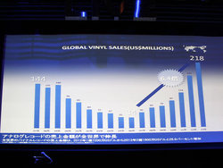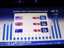また、全世界規模で右肩下がりを続けていたアナログレコードの売上が2006年を境に反転し、以後は伸張を続けているというデータも紹介。2012年と2013年を比べると、1億7,200万米ドルから2億1,800万米ドルへと売上金額が約27%増加したという。