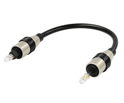 光オーディオケーブルは光角型プラグ-光丸型プラグに対応。ケーブル長は上記のように約10cmで、質量は約30g。伝送損失は1dB以下/λp=650nm。