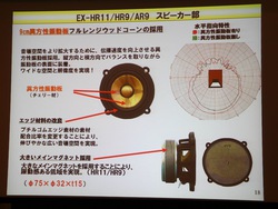 スピーカー部については従来モデル「EX-HR9」をベースとしながら、様々な改良が施された。本機は90mmのフルレンジ・ウッドコーンスピーカーを搭載。音の伝播速度を向上させるチェリー材の薄板シートをウッドコーンの最適箇所に配置した、異方性振動板を採用する。これにより、広い空間再現と高解像度を備えるサウンドを実現するという。ユニットのエッジ材も改良され、ブチルゴムエッジの素材配合比率を変更した。マグネットについてはユニット口径に近いサイズの大型メインマグネットをすることで、躍動感ある低域再現を可能にした。