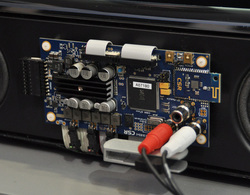中級・ハイエンドレベルのソリューションでは、これに同社のオーディオ向け高性能DSP「MAPX」が加わる。ソフトウェアのプログラミングによって様々なオーディオ入力信号のデコードとポストプロセッシング処理に対応できるキャパシティを備えている。Bluetoothデバイス「CSR8670」では高音質コーデックのaptXに対応するとともに、スマートフォンやタブレットからの音声ストリーミングを受けながら、同時にサブウーファーへの信号の送り出しも可能にしている。こちらも別途アンプを組み合わせるだけで製品開発のベースが整う。もちろんリモコンのコントロール信号もBluetooth経由で飛ばすことができる。