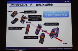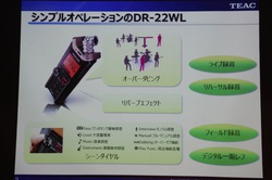 発表会では同社の小泉貴裕氏が登壇。「DR-44WL」と「DR-22WL」についてのプレゼンテーションを行った。冒頭で小泉氏はTASCAMのハンディレコーダーの歴史を紹介。「いち早く最新機能を取り入れてきたTASCAMのハンディレコーダーですが、解決されていないニーズがひとつありました。それはレコーダーを手の届く場所にしか置けないということ。これまでもリモコンを用意してはきましたが、操作できる機能に限りがありました。一方で、レコーディングの要となるのはマイキング(マイクの位置の設定)です。今回の2モデルではWi-Fi経由でスマートフォンからの“ほぼフル操作”が可能なので、ハンディレコーダーでも自由なマイキングが行えるようになったのです」と今回の新製品のポイントを説明した。