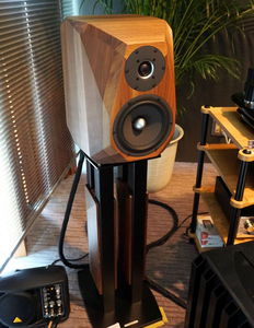 スピーカーはDIAPASONの「Astrera」。ウォールナットの無垢材をヴァイオリン製作とほぼ同じ技法で丹念に組み上げた、30面体のダイヤモンドシェイプが特徴。最初はキューブ上に組み上げた状態から熟練職人が削りだし作業を行い、3ヶ月以上の時間をかけながら仕上げていくという。価格は980,000円(ペア/スタンド無し)。