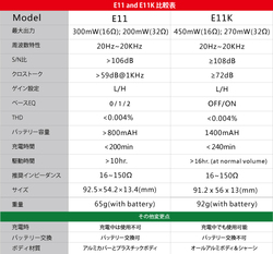 最大出力がE11の300mW から1.5 倍の450mW(ともに16Ω時)へ増大。また、駆動時間もE11より長くなり、最大約16時間の連続駆動が行えるようになった。充電時間は約4時間。なお、MicroUSBの充電ポート搭載し、充電中も本体を使用可能。