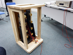 Teragaki-Laboは、独自開発の湾曲パネル方式を採用する寺垣スピーカーを展示。スピーカー内部の構造もすべて確認できるようになっている。