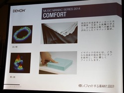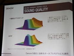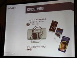 さらに高い評価を得たUSB-DAC「DA-300USB」や発売されたばかりのポータブルヘッドホン「DA-10」を引き合いに出しながら、ポータブルでもデノンサウンドを楽しめる製品に力を入れていることをアピールしていた。また、デノンがヘッドホンブランドとしても50年の歴史を誇ることも紹介していた。