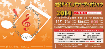 注目のハイエンド機器が集結する関西最大のオーディオイベント「大阪ハイエンドオーディオショウ2014」が、11月7日(金)、8日(土)、9日(日)の3日間にわたって、大阪ハートンホテル心斎橋にて開催される。入場料は無料。