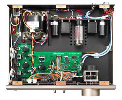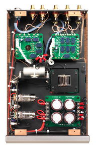 管球式の無帰還ユニットアンプを搭載。過渡特性に優れ、音質に定評のある「ECC803(12AX7)」を無帰還SRPP型増幅回路、「6922(6DJ8)」を出力バッファーとして採用した。