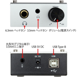 ヘッドホン出力は3.5mmと6.3mmを別々に1系統ずつ装備。端子類には、USB(Type-B)、丸型光デジタル端子/3.5mmミニ出力、USB補助電源端子を搭載しており、PCとの接続はUSB(Type-B)接続のみのバスパワー。必要によってUSB補助電源(USB 5V DC)を使用するよう案内している。