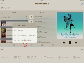 キューの作成や保存についても、使い勝手に配慮して様々な機能が盛り込まれている。リストから楽曲名をタップするとキューへ追加されるのだが、下の画像で赤丸印をつけたボタンから、タップによってキューに追加する位置を「すぐに再生」「次に再生」「キューを消去してすぐに再生」「キューの最後に追加」の4つからあらかじめ指定できるようになっている。