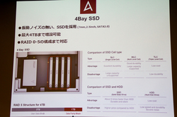SSDは標準で1TBの内蔵だが、スロットは4ベイを内蔵しており、最大4TBまでの増設が可能。RAID構成にも対応している。内蔵SSDの容量、RAID構成の有無は受注時に変更を受け付ける。また、購入後のSSD増設にも対応予定とのこと。なお、外付けHDDを接続することで、ライブラリのバックアップを取ることも可能だ。