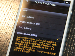 大きなアップデートは、上述の通りスマートフォン内のMP3/AACやWAV/FLACなどの音源を、DSD 2.8MHzまたは5.6MHzにリアルタイム変換してDoP出力する「リアルタイムDSD変換」機能に対応すること。また、DSD 3,6,12MHzのDoP出力機能にも新しく対応する。「設定」メニューの「DSD」項目に、リアルタイムDSD変換の項目とDSD 3,6,12MHzのDoP出力の項目が追加される。