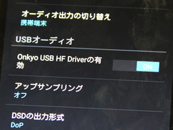 また、Android向けには、OTGケーブルを介したUSBオーディオ出力で、ハイレゾ出力をサポートするためのUSBサウンドドライバー「Onkyo USB HF Driver」機能が実装される。「設定」メニューの「USBオーディオ」に、「Onkyo USB HF Driverの有効」という項目が新しく追加され、機能のON/OFFを選択することができる。