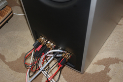本機の特徴のひとつが、ミディアムトゥイーター(写真の中央の赤い部分)をリモートコントローラーで自在な角度に動かせること。赤い部分が手前にせり出してきて、好きなポジションに調整することができる。部屋の音響特性や試聴ポジションに合わせて、最適な設置が行えるのだ。本体は6つの独立したアルミニウム筐体となっており、6つのモノブロックアンプとそれぞれ接続することができる。