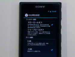 ハイレゾ音源では新たにDSD 128(5.6MHz)に対応(※PCM変換)。また、DSD楽曲の音楽特性に合わせた2つの音楽特性を選べるデジタルフィルターを搭載。DSD特有の柔らかさや温かみのある音だという「スローロールオフ」、明瞭でアタック感、パワー感のあるエネルギッシュな音だという「シャープロールオフ」の2種類を切り替えられる。そのほかDSDのゲイン設定も追加。0dBと03dBで設定できる。