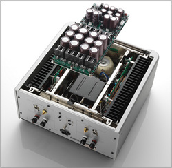 パワーアンプモジュールには、大型バイポーラLAPT素子を5パラレル・プッシュプルとした3段ダーリントン構成を採用。バイポーラ素子の優れた高域特性を素直に引き出すため、部品点数やパラレル数を極力減らしたシンプルな増幅回路とした。ここで採用されたバイポーラLAPT素子は連続動作17アンペア、瞬間動作34アンペアの電流供給能力を持っており、高出力に加えて優れた高域特性を可能にする。