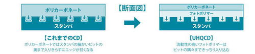 今回開発されたUHQCDで採用されている手法では、ポリカーボネートを基板としながら、スタンパーに刻まれた信号を転写する部位には、ポリカーボネートではなくフォトポリマーを使用している。