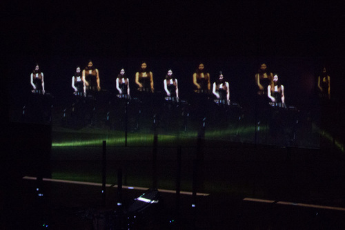 パフォーマンスでは、加藤訓子さん自身の演奏に先立って、『IX』収録の「プレイアデス 〜6人の打楽器アンサンブルのための〜」の映像+サウンドインスタレーションが行われた。これは、訓子さんが演奏した6人分のパートをそれぞれスピーカーから再生し、それに合わせて巨大スクリーンに映像を映し出すというものだ。
