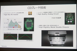CDプレーヤー「SL-C700」はCDの音源を最大176.4kHz/32bitまでアップサンプリングできる「High Res Re-master」機能も搭載し、ハイレゾ時代にも対応した楽しみ方ができることを紹介していました。